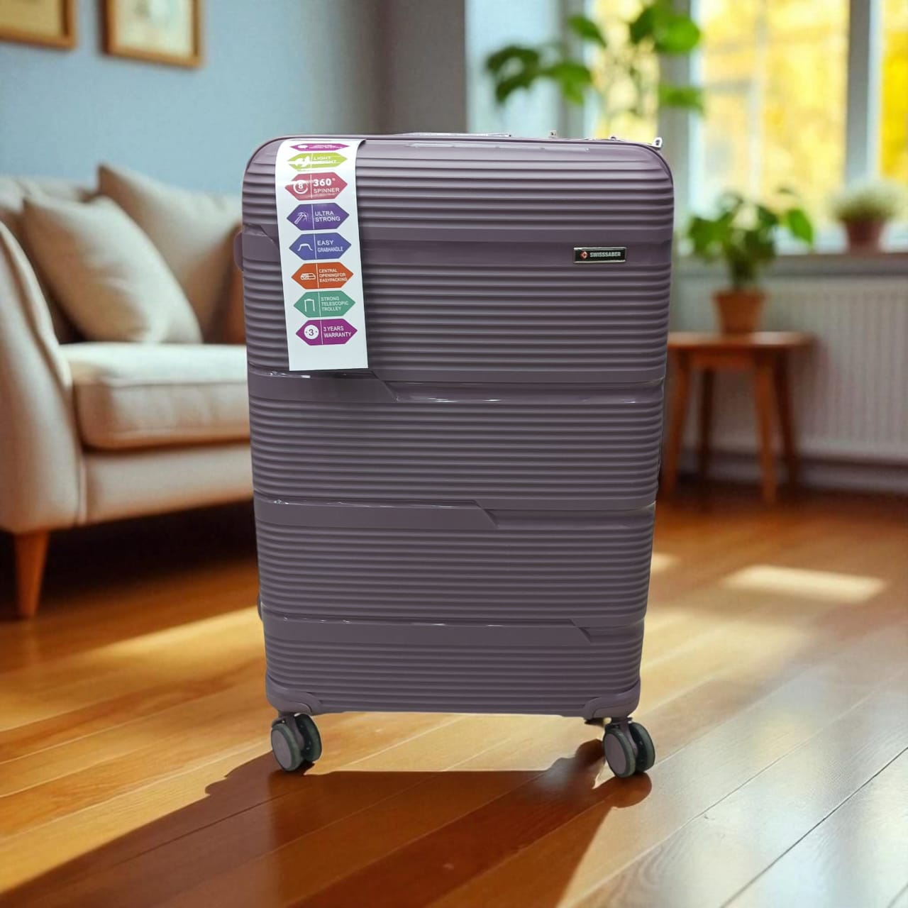 Made from durable PP material, the Swiss Saber suitcase features 360° revolving wheels for seamless maneuverability. It includes an expandable zipper to increase packing capacity, an antitheft zipper for enhanced security, and a TSA-approved lock to ensure safe and compliant travel.